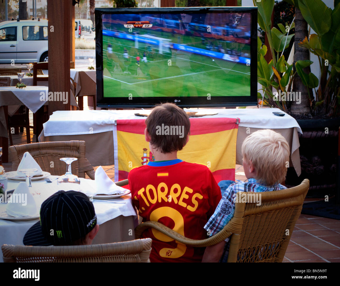 Children Watch World Cup Football On A Television Screen Outside A Spanish Restaurant In Alcudia Majorca Stock Photo Alamy